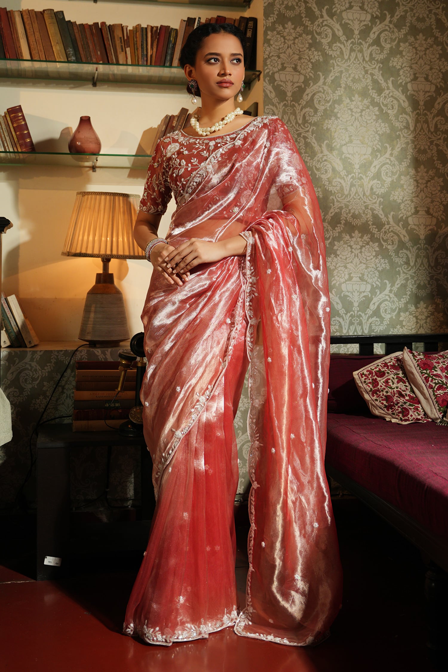 Silver red saree with embroidered floral patterns